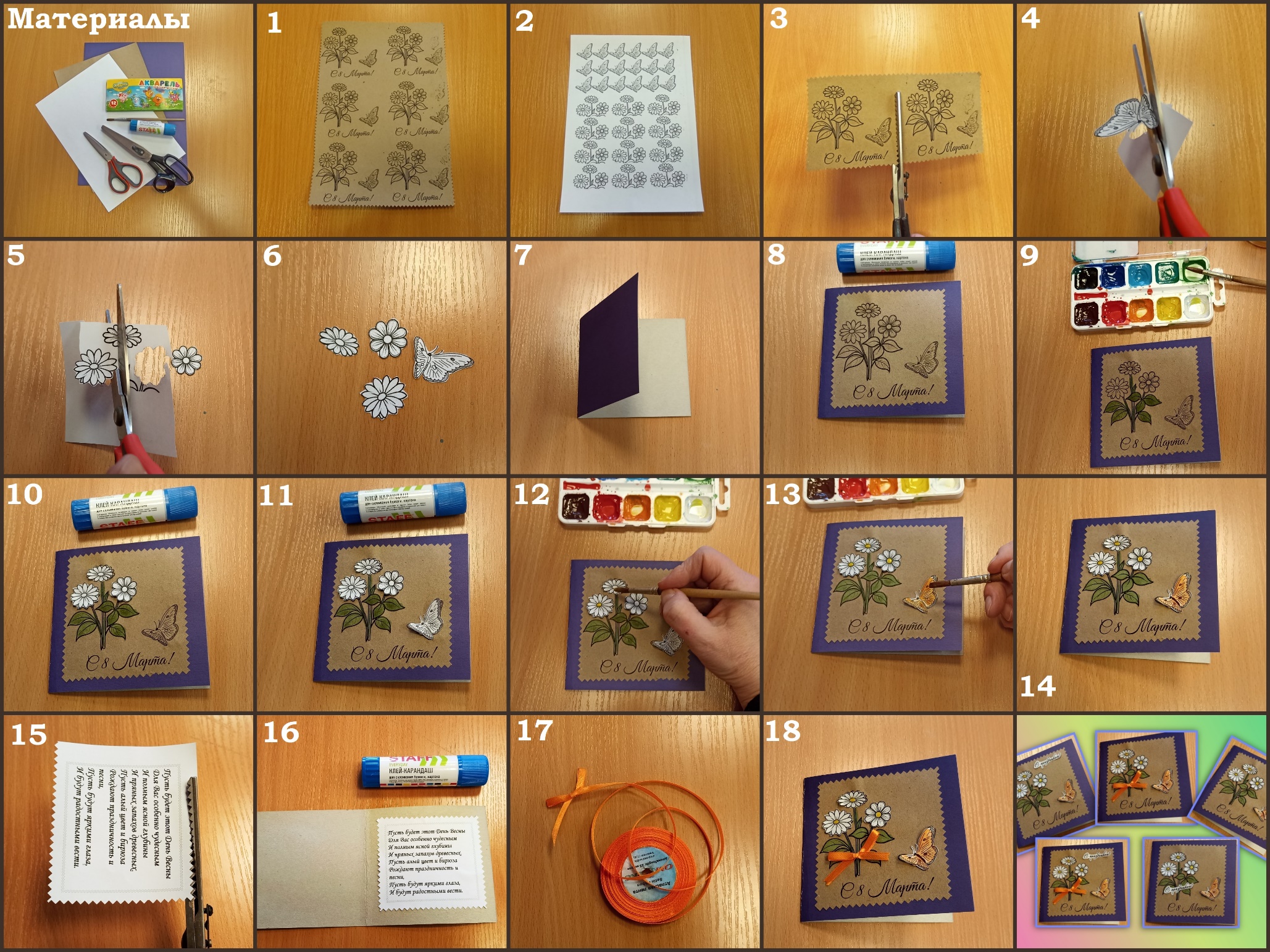 Для учителя: Компьютер (ноутбук) с выходом в сеть Интернет, схемы пошагового выполнения работы, крафт-бумага, белая бумага, плотный картон (цветной), акварельные краски, кисть для краски, баночка для воды, клей-карандаш, ножницы, фигурные ножницы, шаблон с надписью: «С 8 Марта!» и рисунком букет цветов и бабочка, поздравительный текст.