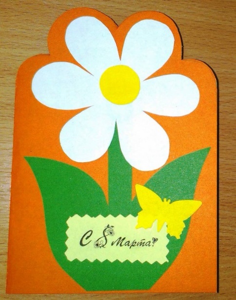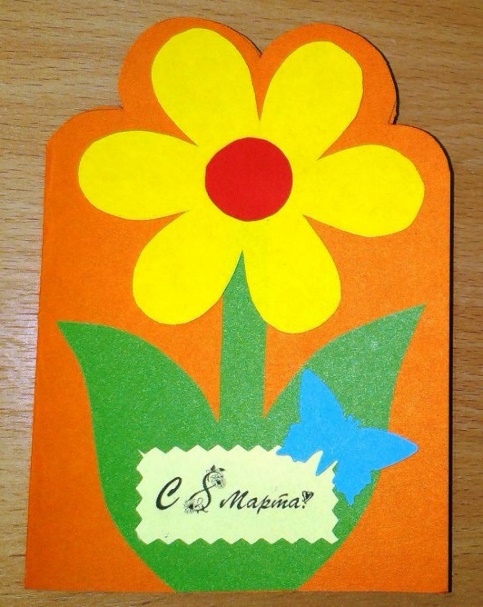 - на наружную сторону открытки приклеиваем цветок и внизу открытки приклеиваем надпись «С 8 марта»