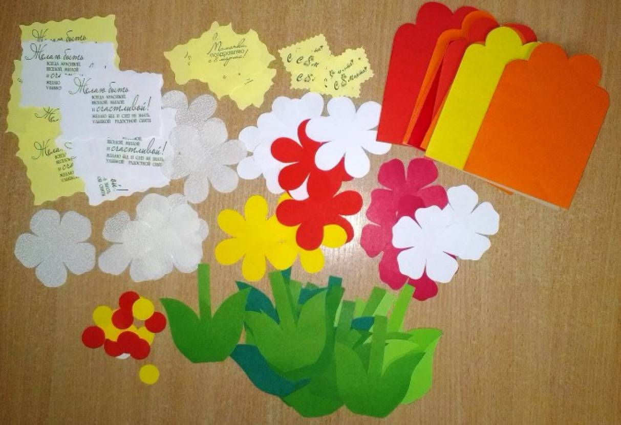 Оборудование: цветной картон; цветная бумага; шаблоны: открытки, цветов, листьев; напечатанные поздравления для мамы, надпись с 8 марта; клей, ножницы, простой карандаш.