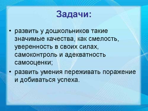 Поэтому основными задачами моей работы стало: развитие у дошкольников таких значимых качеств, как: смелость, уверенность в своих силах, самоконтроль и адекватность самооценки, развитие умения переживать поражение и добиваться успеха.
