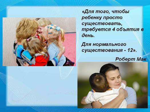 мериканский хирург Роберт Мак обнаружил и подарил такую хитрость: «Для того чтобы ребенку просто существовать, требуется 4 объятия в день. Для нормального существования - 12».