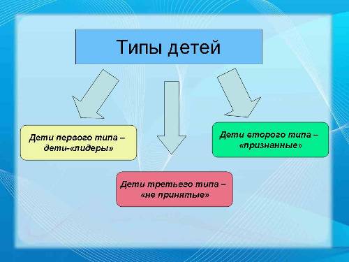 В каждой возрастной группе есть, по крайней мере, три типа детей. Это дети-«лидеры», «признанные» и «не принятые», которые по-разному ведут себя во время любой деятельности, в том числе игровой, и соответственно требуют разного подхода.