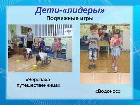 Дети первого типа – дети-«лидеры», они очень активны, подвижны, склонны к сильному возбуждению. Они охотно включаются в новую игру, стараются взять на себя активную роль. С этими детьми можно играть в игры со строгим выполнением правил, например: «Черепаха-путешественница», «Водонос».