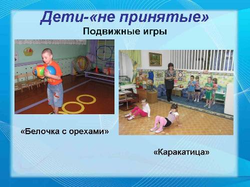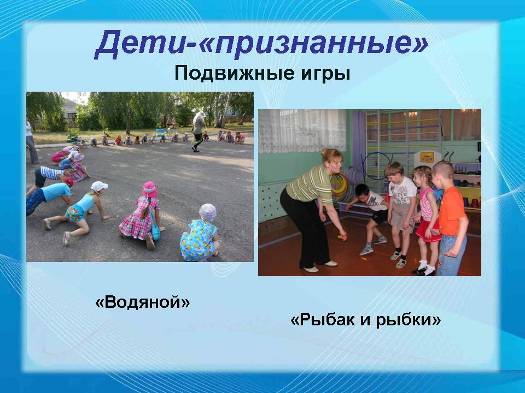 ети второго типа – «признанные», более робкие, осторожные. Они обычно не сразу понимают суть игры и не слишком охотно переключаются на новую для них деятельность. Сначала они держатся напряжённо, без интереса. Ни в коем случае не надо заставлять ребёнка брать на себя активную роль, пока он не будет готов к этому. Для этих детей будут привлекательны игры с простыми действиями, в которых результат зависит от сосредоточенности и ловкости, от внимания. Иногда полезно «сыграть» на самолюбии детей, выразив сомнение в их ловкости, а в конце игры признать ошибочность своих сомнений, похвалив смелость и быстроту движений каждого ребенка. С детьми этой группы можно поиграть в игры: «Городки», «Рыбак и рыбки», «Водяной».