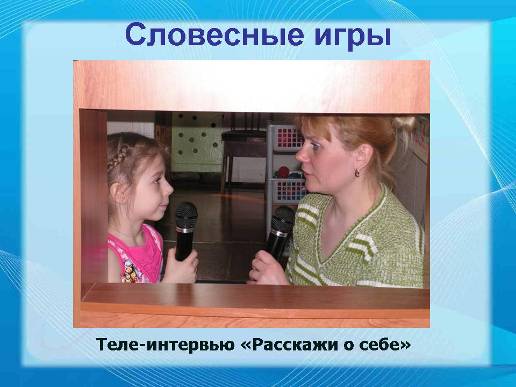 редлагаю вашему вниманию игру - интервью « Расскажи о себе», которую использую в работе с детьми. Игра не сложна, её можно применять в совместной деятельности, на занятиях, как в помещении, так и на прогулке. Цель игры - обогащать игровой опыт каждого ребёнка, что оказывает благотворное влияние на уверенность в себе, чувство собственного достоинства.
