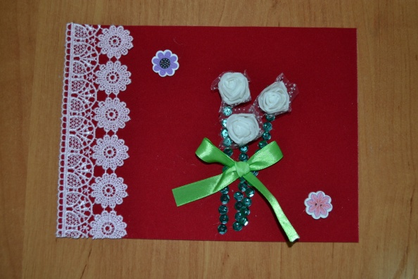 Оформить открытку с помощью пайеток, ленточек, бусинок.