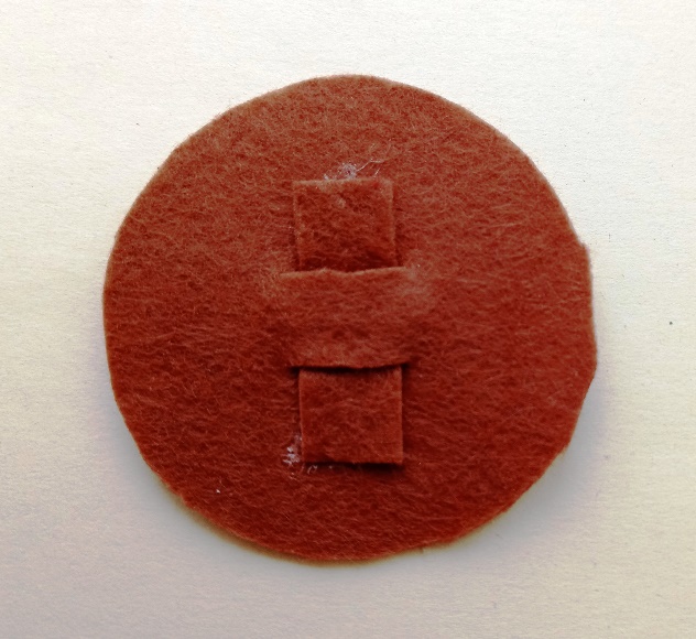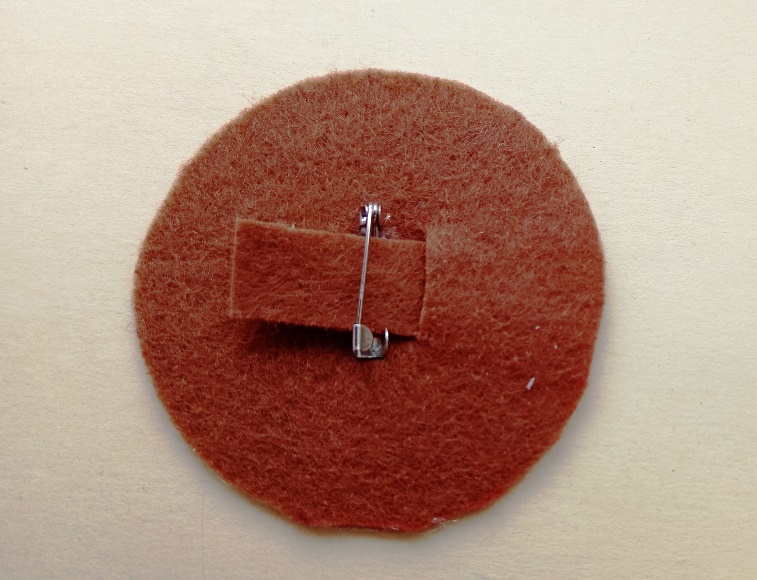 Шаг 11. Приступаем к оформлению застёжки. Для этого заготовку из фетра сворачиваем пополам, и делаем в центре разрезы примерно 1 см шириной, между разрезами также делаем расстояние 1 см. В разрезы вставляем подготовленную полоску фетра. Один кончик этой полоски приклеиваем к кружочку. Второй конец полоски продеваем через разрез, переворачиваем кружок и на другой стороне на полоске закрепляем булавку. Подклеиваем булавку к кружку. Затем полоску продеваем через второй разрез и на изнанке подклеиваем. |