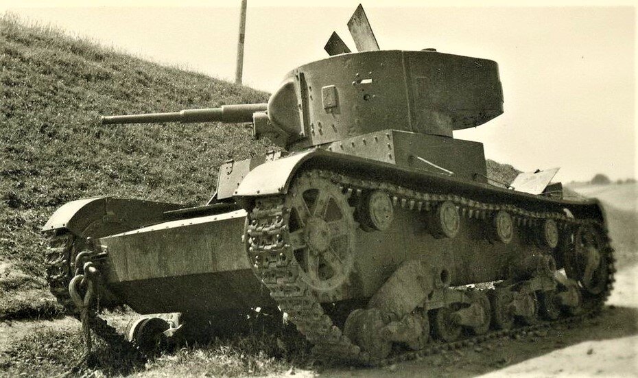 Т-26. Лёгкий танк, разработанный ещё в начале 1930-х. К началу войны это был самый массовый лёгкий танк РККА. Использовался для поддержки пехоты