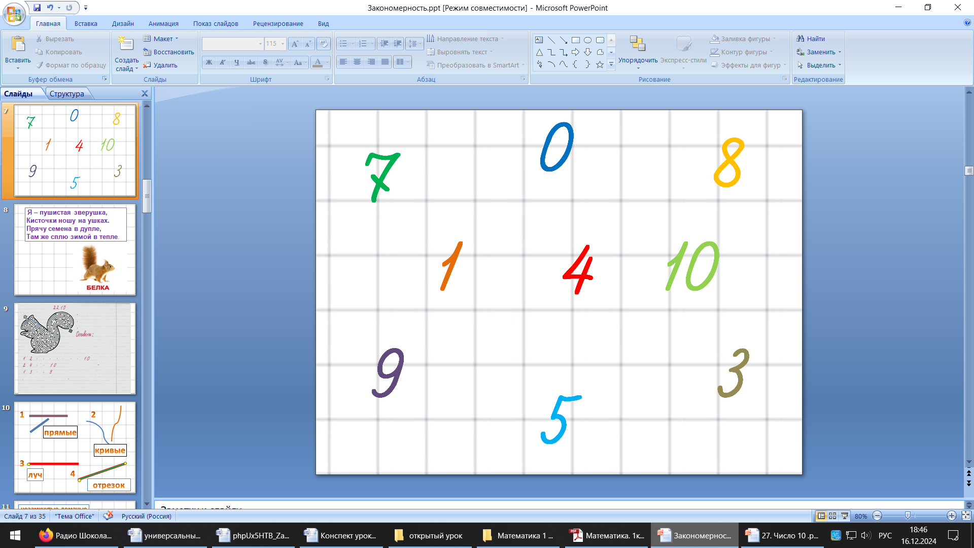 Назовите числа в порядке увеличения. Покажите какие числа пропущены? Назовите числа, которые больше 3. Назовите числа, которые меньше 9. 2. Графическая минутка. Отгадайте загадку. Я – пушистая зверушка, Кисточки ношу на ушках. Прячу семена в дупле, Там же сплю зимой в тепле. - Откройте рабочие тетради и найдете в них лабиринт в виде белочки. Постарайтесь пройти его не задев стен лабиринта. На слайде: - Какую линию вы использовали, чтобы пройти лабиринт? - А какие ещё линии мы знаем? - Посмотрите на экран, какие это линии? - А если отрезки встанут в хоровод, то получится не просто ломаная линия, а …? | - 3+2=5; 5+2=7; 7+2=9 - 9-1=8; 7-1=6; 4-1=3; 1-1=0 Было - 6 грузовиков Приехал – 1 грузовик Стало - ? 6+1=7 Ответ: стало 7 грузовиков. - 0, 1, 3, 4, 5, 7, 8, 9, 10. - 2, 6. - 4, 5, 7, 8, 9, 10. - 0, 1, 3, 4, 5, 7, 8. - Белка - Кривую - Прямые, лучи, отрезки. - Ломаные. - Замкнутая ломаная |