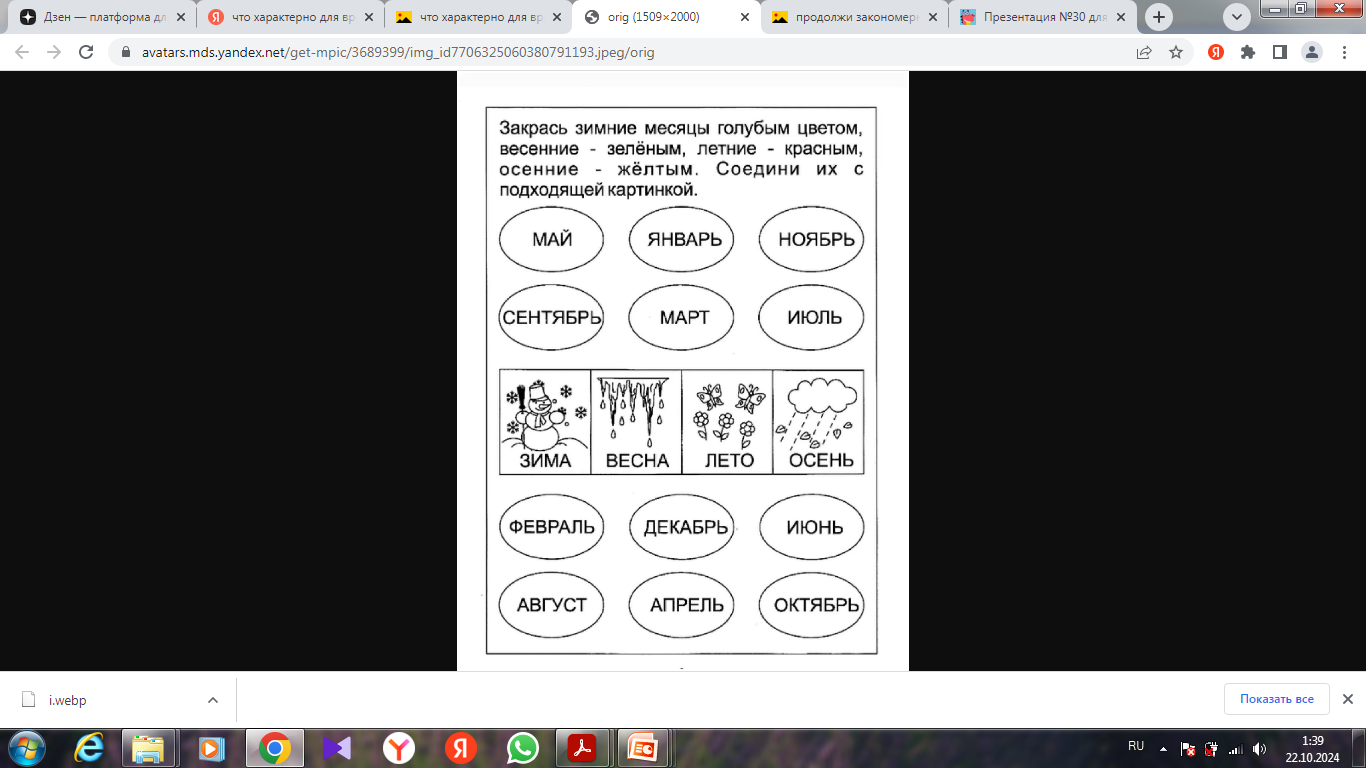 Задание повышенной сложности (по выбору учителя) -Восстановите последовательность смены календарных месяцев. Закрасьте название зимних месяцев синим цветом; весенних – зелёным; летних – красным; осенних – жёлтым.