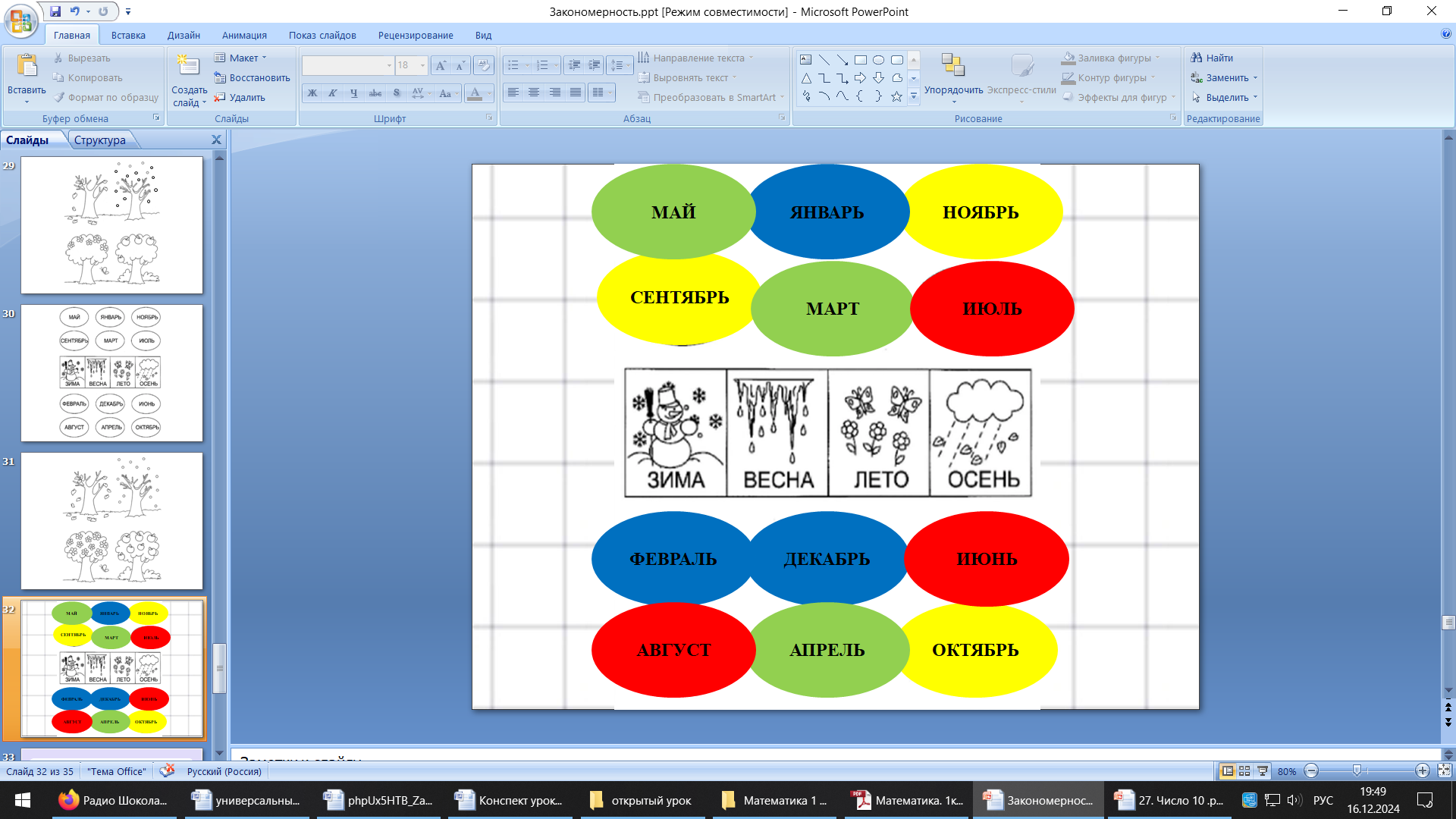 Оборудование: для учителя: ПК для демонстрации презентации; карточки – схемы «Времена года», «Календарные месяцы»,