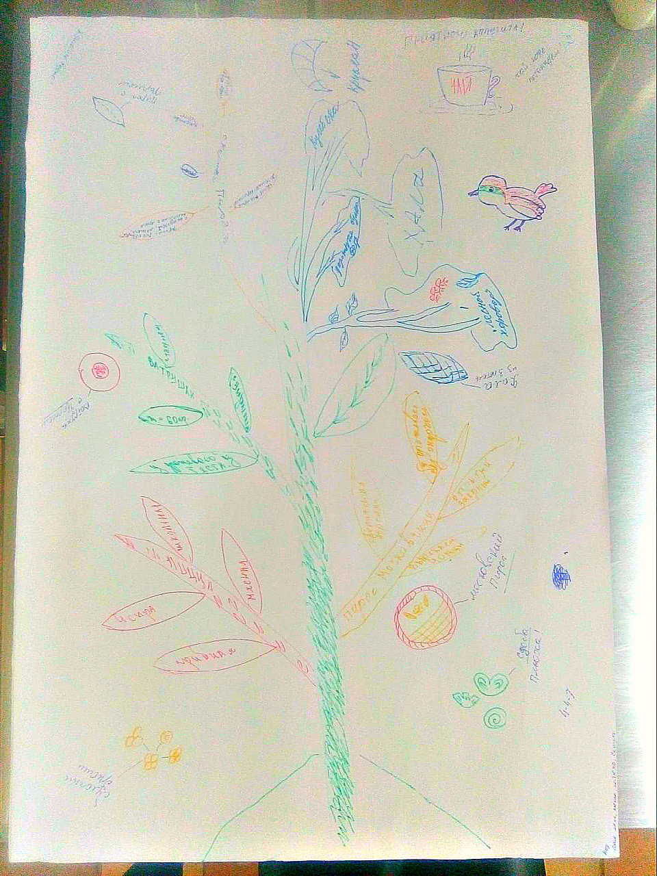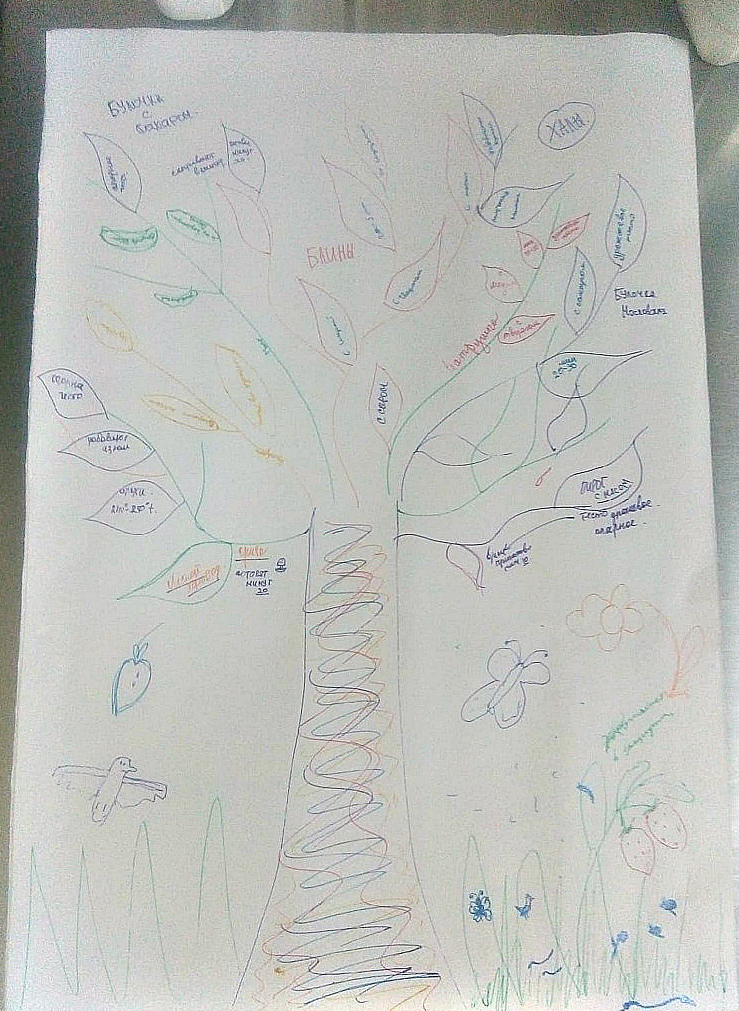 3. Выполнение творческого задания (группа делиться на две команды, на листе ватмана нарисовать ствол дерева — это дрожжевое тесто, к дереву нарисовать ветки — это названия дрожжевых изделий, к веточкам рисуем листочки — это информация о изделии, например, каким способом замешиваем тесто, вес п/ф, температура выпечки и т.д. Чем больше параметров, тем пышнее ветка с листьями) (фото в приложении)