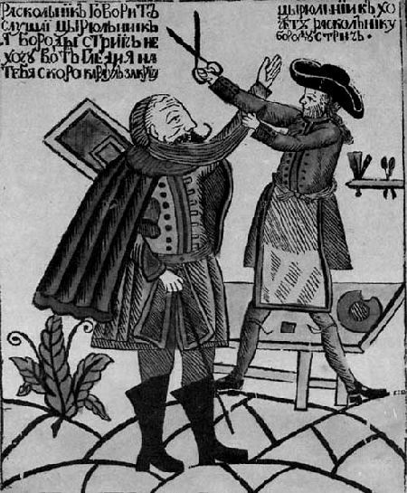 1. “Цирюльник стрижет раскольника”(русский лубок). На картинке нашел отражение петровский указ 1698 года о бритье бород.