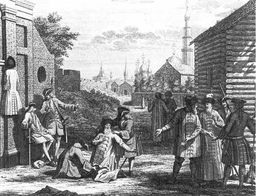 2. “Укорочение кафтанов на заставе”(гравюра). В 1700 году Петр издает указ о ношении европейского платья. Нарушителей этого указа предписывалось поставить на колени и обрезать одежду наравне с землей.