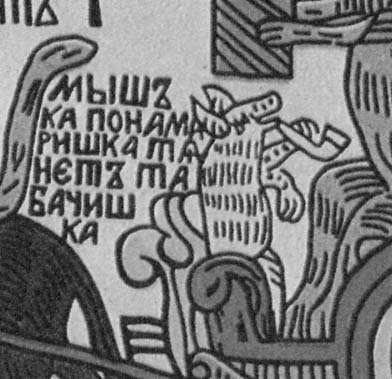 3. “Мыши кота погребают” (русский лубок, фрагмент). Рядом с одной из мышей четко видна подпись: “Мышка пономаришка тянет табачишка”. Мода на курение табака была введена в России Петром I.