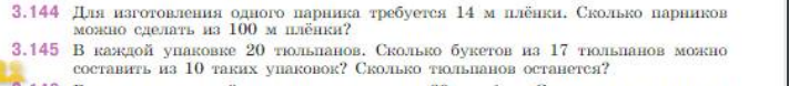 100:14= 7 (ост.2) ответ: 7 парников 20·10=200(т) 200:17=11(ост.13) ответ: 13 т упр.3.147 стр.94
