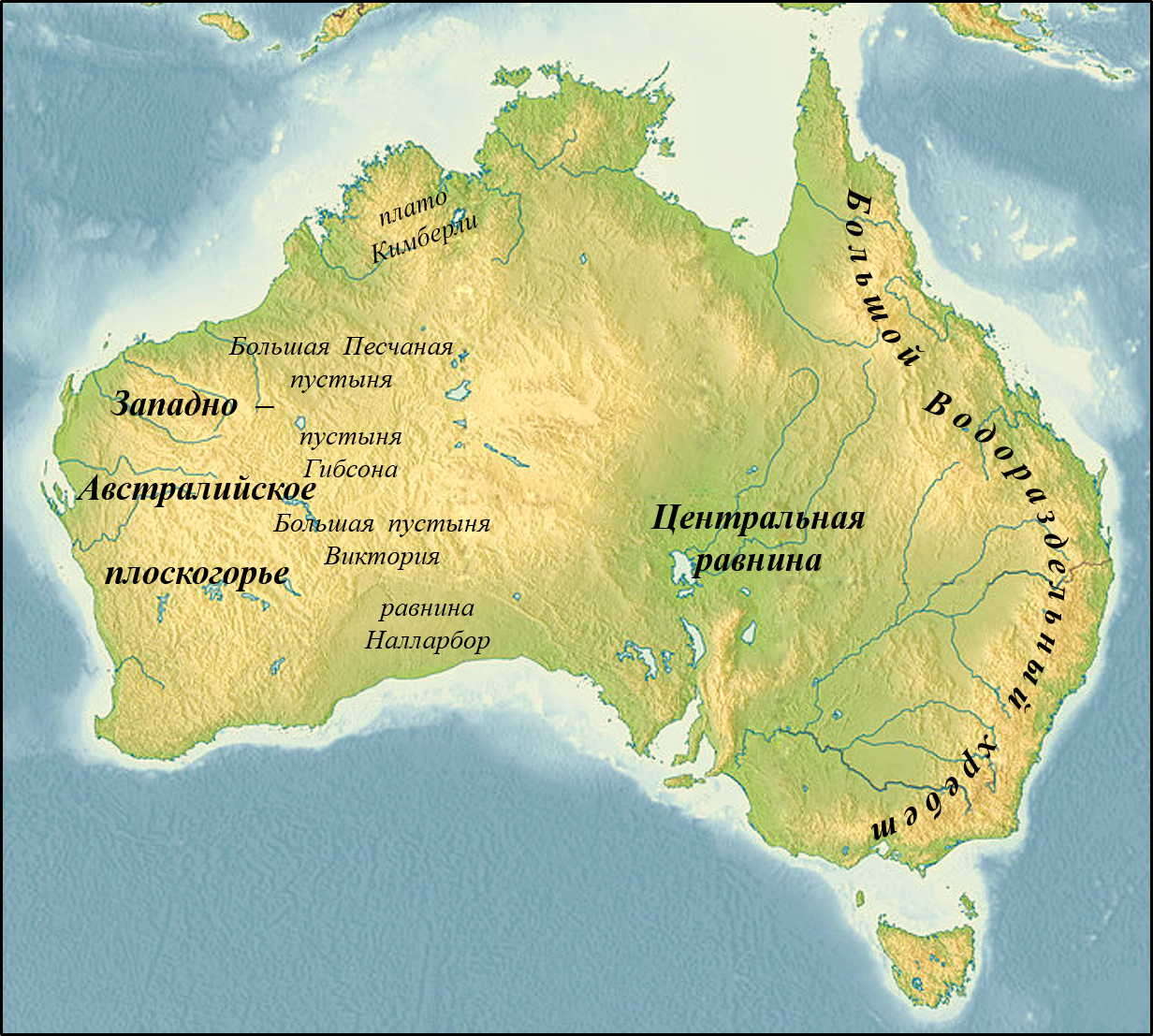 Западная часть континента – Западно- Австралийское плоскогорье с расположенными на нем тремя австралийскими пустынями: Большая Песчаная, Большая пустыня Виктория и пустыня Гибсона.