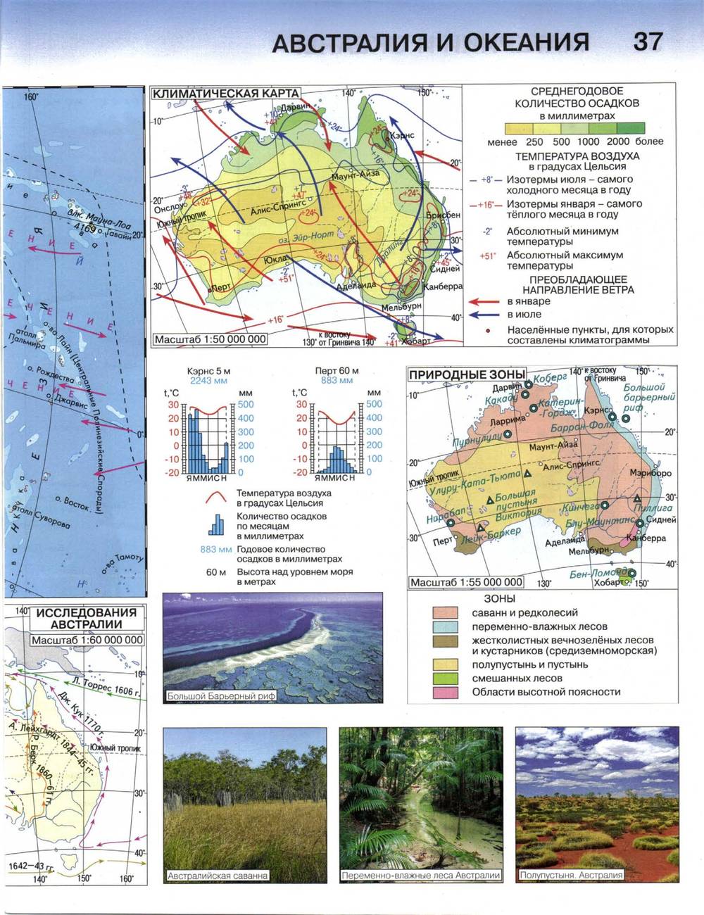 Знать основные формы рельефа, климатические пояса и водные объекты Австралии.