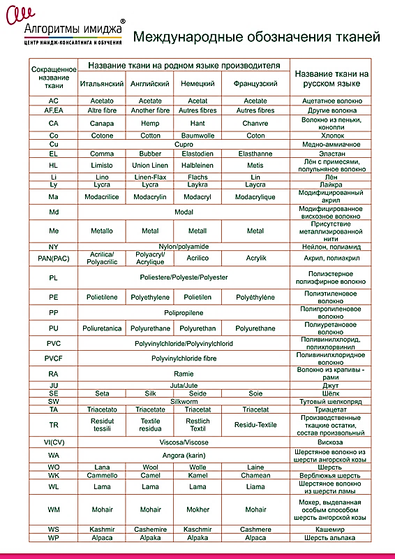 С помощью таблицы: «Международные обозначения состава тканей» по предложенной этикетке определите сырьевой состав изделия.
