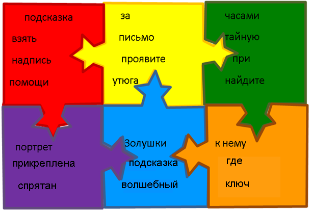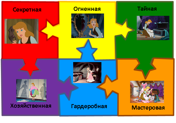 На экране все испытания интерактивной игры «Спасение Золушки». Перед уроком вы разделились на две команды, выбрав листочки определенного цвета. На листочках напишите название вашей команды и свое имя. Этот листочек будет прикрепляться к пазлу каждого этапа. Команда получила маршрутный лист. Вы должны пройти 6 комнат и собрать 6 пазлов, чтобы получить подсказку и освободить Золушку. Команда самостоятельно выбирает любой маршрут, любую комнату и направляет своего игрока в эту комнату для выполнения задания. Пока игрок не выполнит задание, двигаться дальше нельзя. Он получает дополнительное задание или выбирает подсказку: