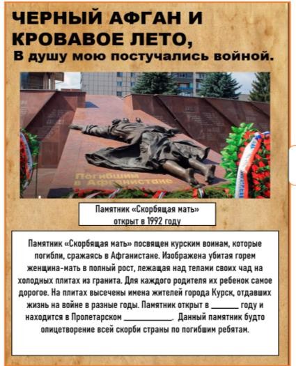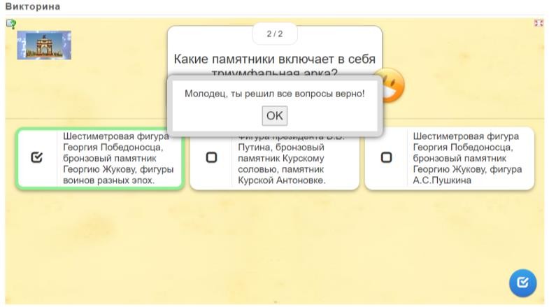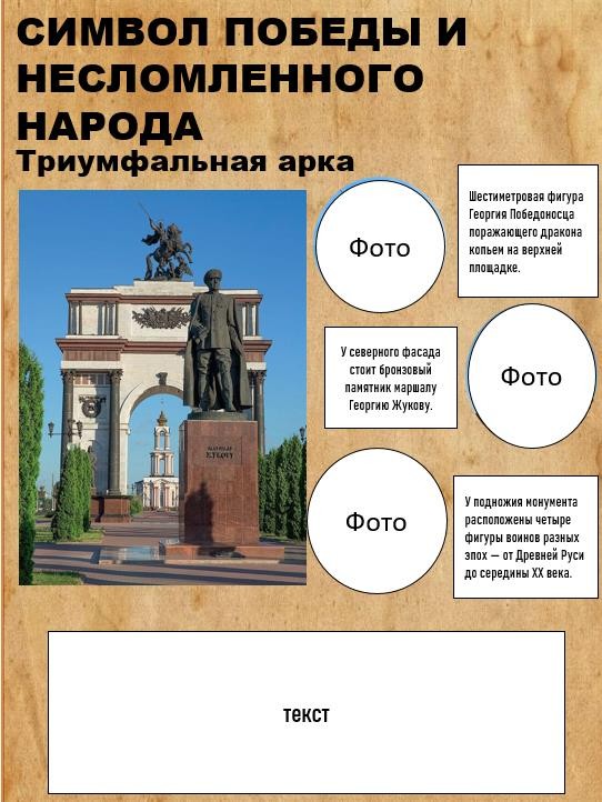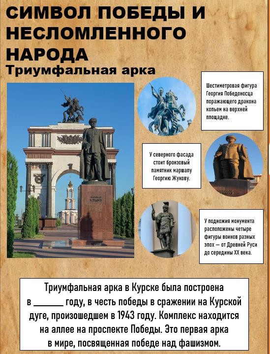 Текстна планшете. «Триумфальная арка вКурске была построена в2000году, вчестьпобедывсражениинаКурскойдуге,произошедшем в 1943 году. Комплекс находится на аллее на проспекте Победы. Этоперваяаркавмире,посвященнаяпобеденадфашизмом. Триумфальная арка – это мраморное сооружение высотой 24метра, сшестиметровой фигурой Георгия Победоносца поражающегодраконакопьемнаверхнейплощадке.Усеверного фасада стоит бронзовый памятник маршалу Георгию Жукову. Уподножия монумента расположены четырефигурывоиновразныхэпох—отДревнейРуси до середины ХХ века. На стенах — тексты, славящие русский военный дух всех времен. Вночноевремяаркуподсвечиваютчугунныеторшерыи софиты. Теперь это визитная карточка города Курска и символ Курскойбитвы1943года.Излюбленноеместодляпрогулок горожан. Сюда приезжают новобрачные куряне, чтобы поклониться Вечному огню, возложить цветы и сфотографироваться.Триумфальнаяарка–символсилы, непобедимого русского духа!» Лернингзадание.