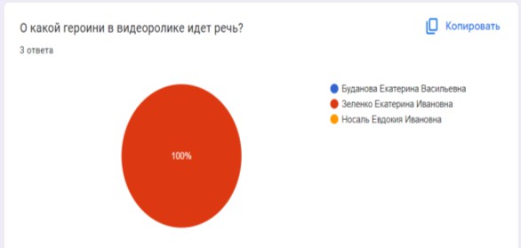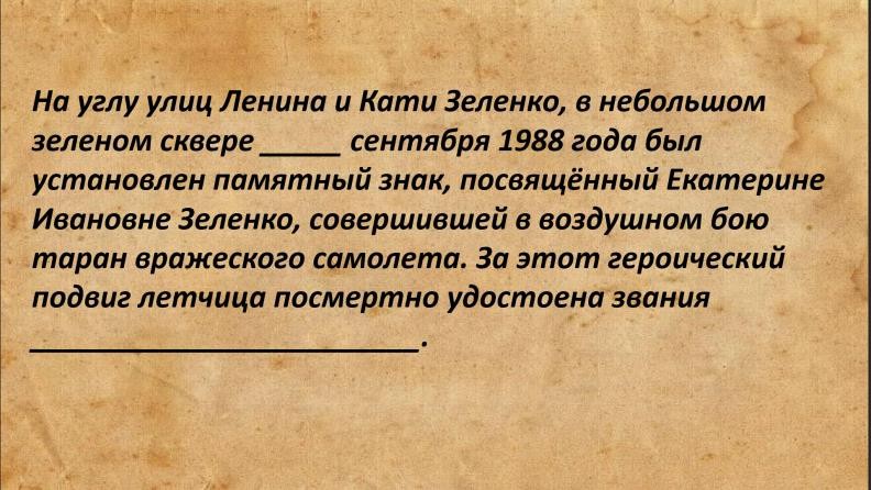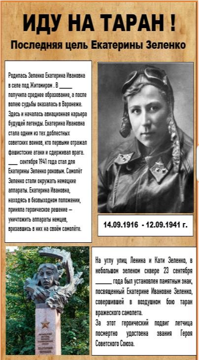 | На углу улиц Ленина и Кати Зеленко, в небольшом зеленом сквере 23 сентября 1988 года был установлен памятный знак, посвящённыйЕкатеринеИвановнеЗеленко, совершившей в воздушном бою таран вражескогосамолета.Заэтотгероический подвиг летчица посмертно удостоена звания Героя Советского Союза. Демонстрируютнадокументкамере. Отвечаютустно. Демонстрируютнадокументкамере. -Самолет. Выполняютработувгруппе. |