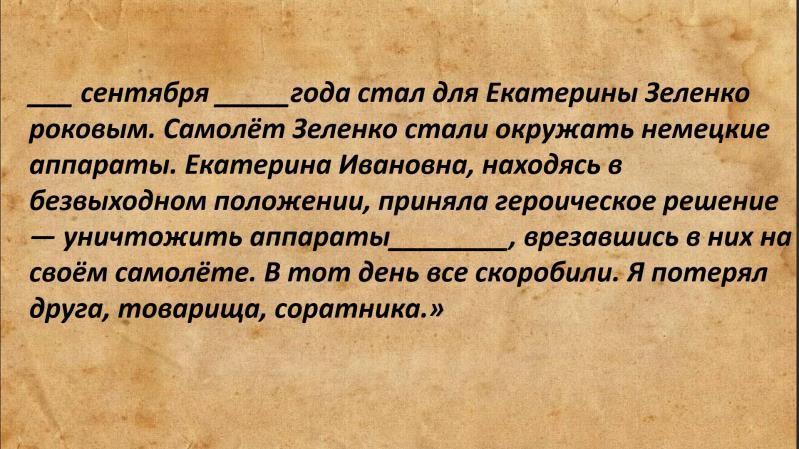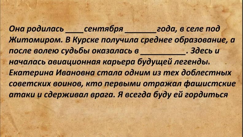 -На ваших партах лежат конверты с фрагментами письма другаЗеленкоЕкатериныИвановны.Внемонрассказывает о жизни летчицы, но письмо уже старое и его фрагменты имеют повреждения.Изучите фрагменты и восстановите утерянные данные, заполнив пропуски. Вы можете пользоваться биографией Зеленко Екатерины Ивановны на вашем планшете. 1 пара.