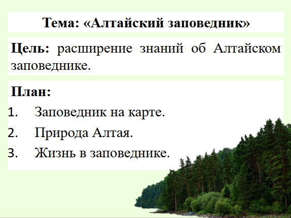 Цель: расширение знаний обучающихся о растениях и животных Алтайского заповедника, его расположении.