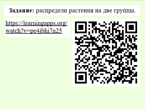 - Вторая команда, на ваших столах лежат планшеты и кьюар коды, возьмите планшеты, разблокируйте их, зайдите в приложение для сканирования кьюар кодов, отсканируйте кьюар код, перейдите на сайт по ссылке. - Вам необходимо распределить растения на две группы: которые есть в заповеднике и, которые не могут произрастать в этой природной зоне и в заповеднике. - Приступайте к выполнению задания. (https://learningapps.org/watch?v=pe4jbhi7n25)