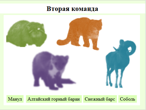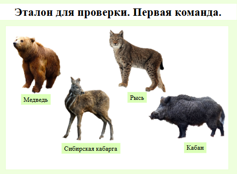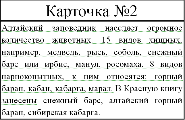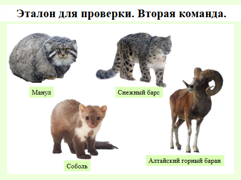 - Вторая команда сравните с эталоном на экране ответы первой команды, верно ли они выполнили задание? - Я согласна с вами, первая команда вы верно выполнили задание. - Первая команда сравните с эталоном на экране ответы второй команды, верно ли они выполнили задание? - Молодцы! Мы узнали, какие животные населяют территорию заповедника. - Обе команды выполнили задание правильно и получают ромашки. (Ромашки вывешиваются на флипчарт). - У вас на столах лежит карточка, в ней содержится информация о животных Алтайского заповедника.