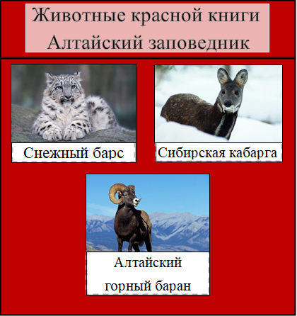 ПРЕДМЕТНЫЕ: знать, расположение Алтайского заповедника, животных и растения, которые составляют экосистему Алтайского заповедника, животных, которые занесены в Красную книгу; уметь отличать животных друг от друга по силуэтам, соотносить название животного и его силуэт.