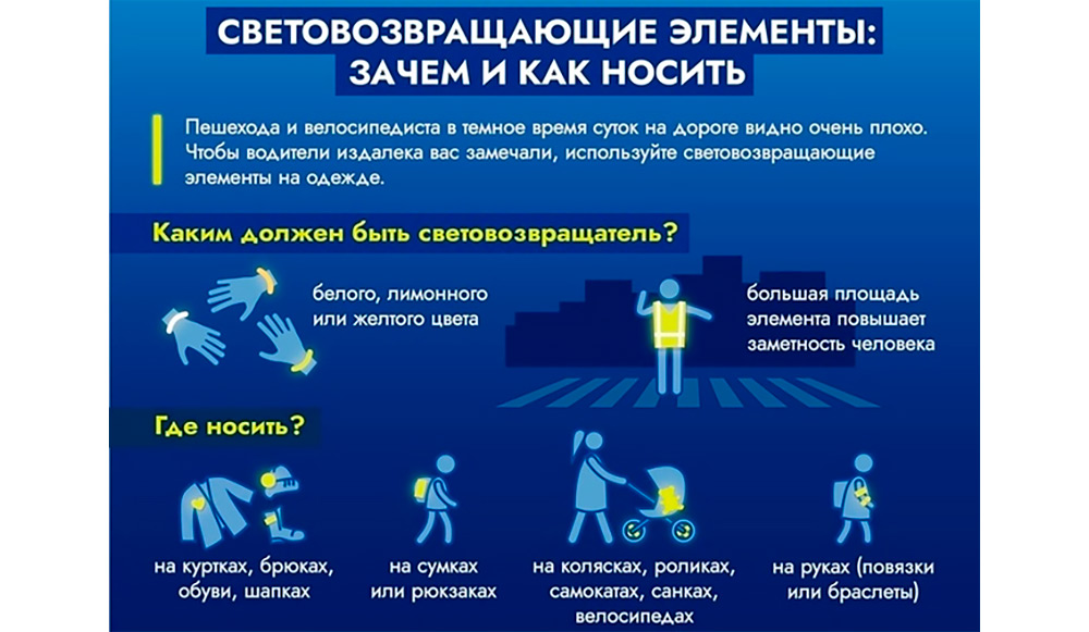 Фликер (значок) – изделие, временно прикрепляемое к одежде или надеваемое на какую-либо часть тела и снимаемое без помощи инструментов. Несъемный фликер (наклейки) – изделие, предназначенное быть постоянно закрепленным. Гибкий фликер (браслет) – изделие, способное наматываться на стержень в любом направлении без видимой деформации. Площадь светоотражающего элемента должна составлять не менее 15 – 50 квадратных сантиметров. | Как правильно носить? Светоотражающие элементы нужно прикрепить к верхней одежде, рюкзакам, сумкам, велосипедам, роликам или детским коляскам таким образом, чтобы при переходе или движении по проезжей части на них попадал свет фар автомобилей.