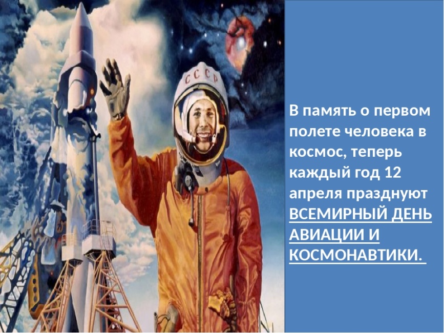 Учитель: Верно. Свой полет в космос Ю.Гагарин совершил 12 апреля 1961 года. С тех пор этот день является праздником в честь летчиков, космонавтов, конструкторов, которые создают ракеты, космические корабли, без которых невозможно было бы освоить космос.
