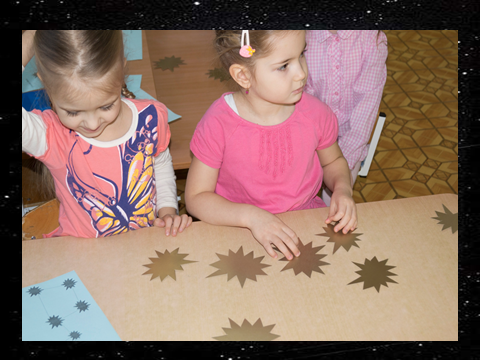 Дети по образцу выкладывают из маленьких звездочек свое созвездие.