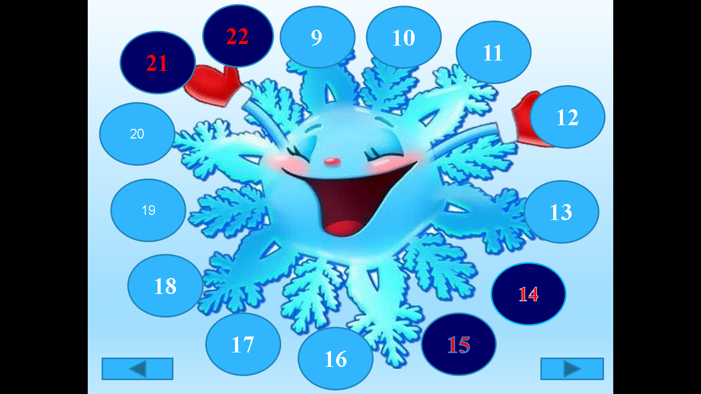 На слайде, вниманию детей представлена снежинка с цифрами, от 9-22, каждая цифра соответствует дню недели 9 - понедельник, 10 вторник, 11 среда и т.д. Цифры 14, 15,21, 22 выделены другим цветом, выходные дни (суббота, воскресенье). За каждой цифрой адвент-календаря, детей ждет увлекательное задание или игра.