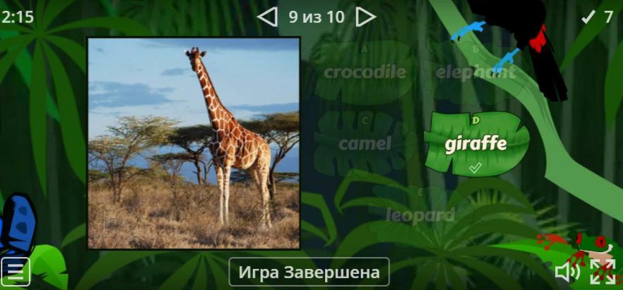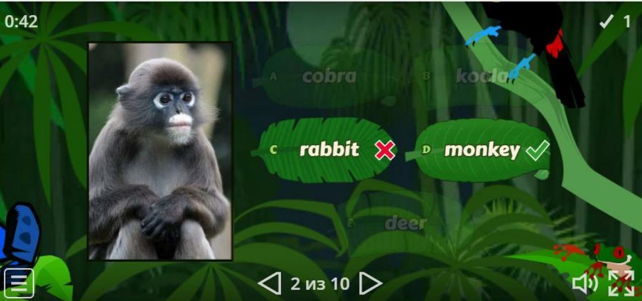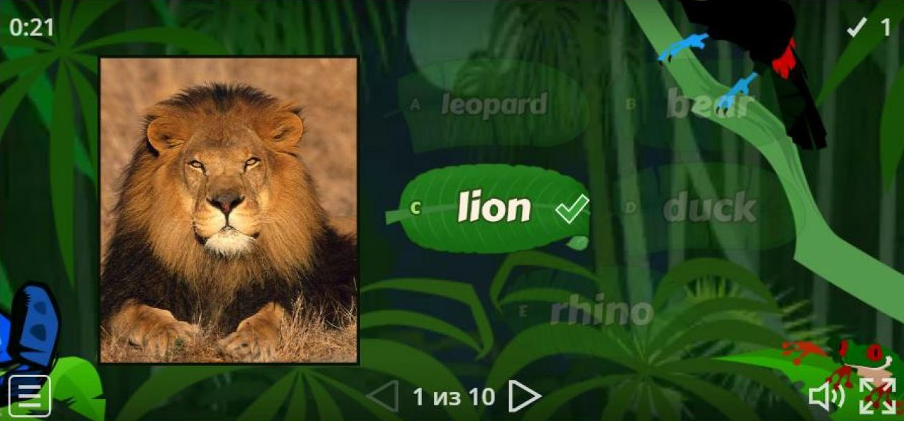 Смотрим на фото животного и выбираем правильный ответ (название животного). Правильный ответ отмечается галочкой и звуковым сигналом,