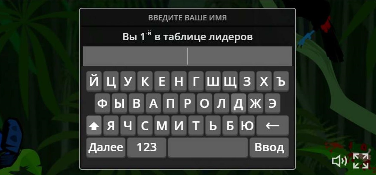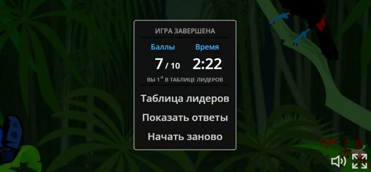 Результаты с количеством набранных баллов и временем прохождения отображаются в таблице.