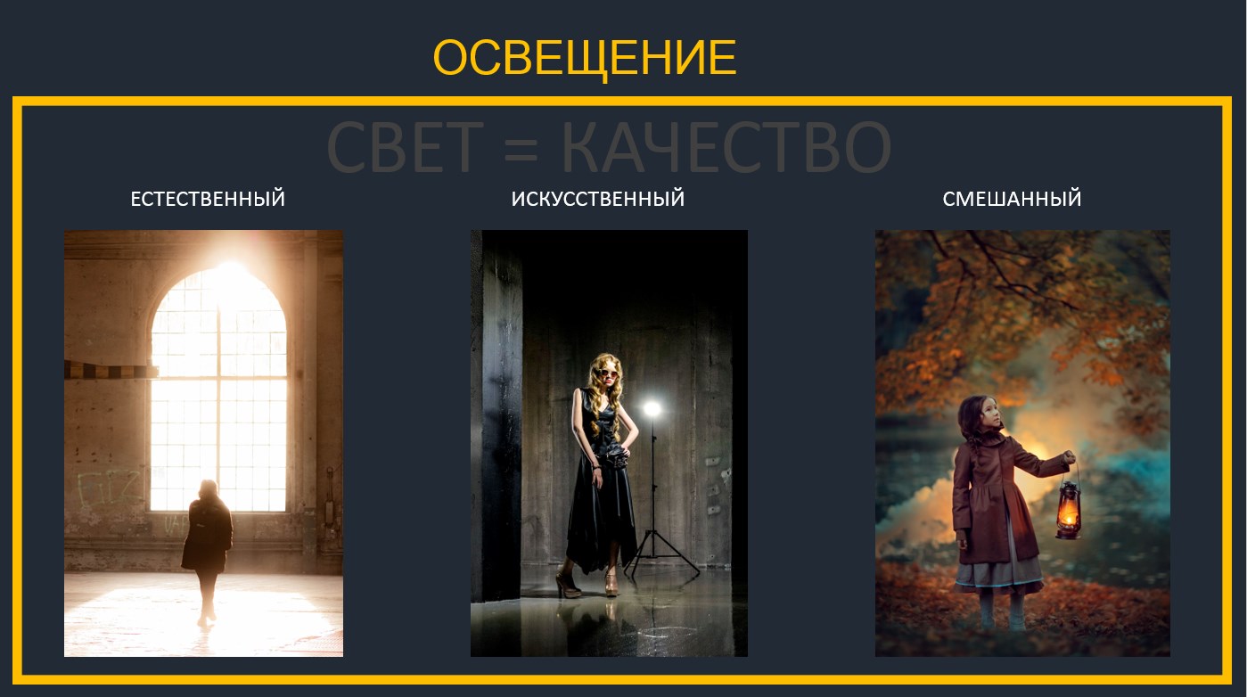 Рядом с идеей всегда стоит свет. Это на самом деле так. Про него ни в коем случае нельзя забывать. Благодаря хорошему освещению мы создаем качественный снимок. Освещение делится на три типа: естественное (природное, от солнца), искусственное (созданное человеком: лампа) и смешанное, когда используются вместе два основных источника.