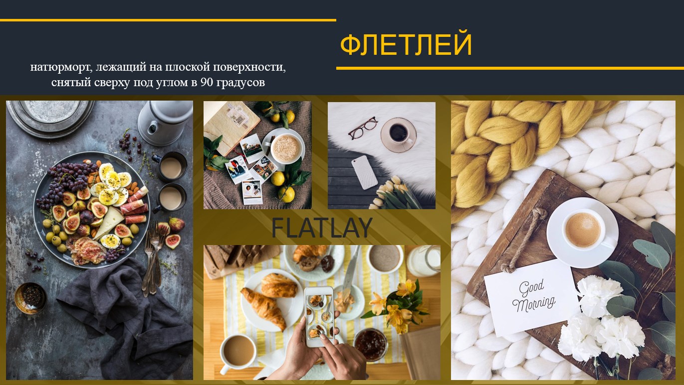 Флетлей — это натюрморт, лежащий на столе или другой плоской поверхности, снятый сверху под углом в 90 градусов.
