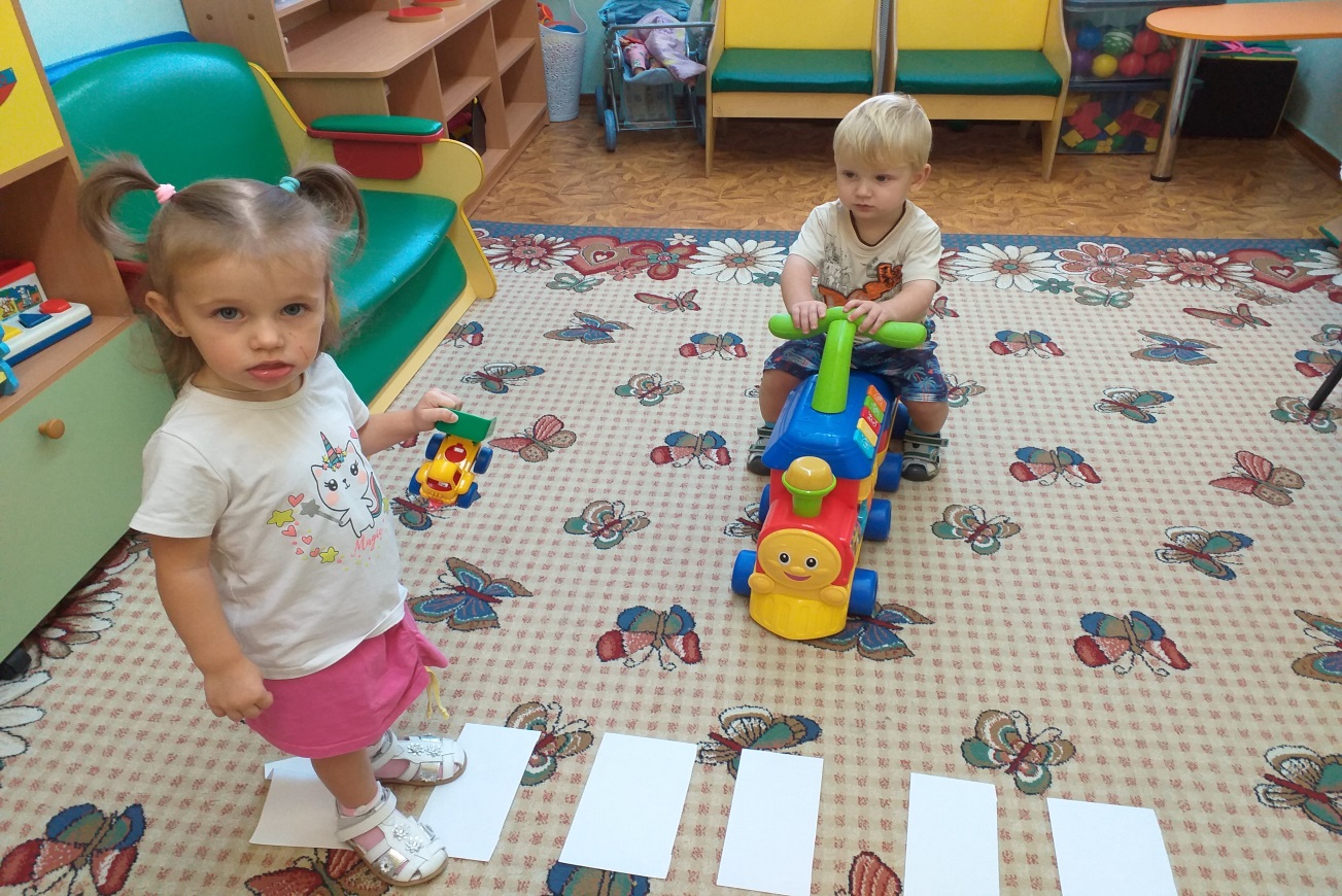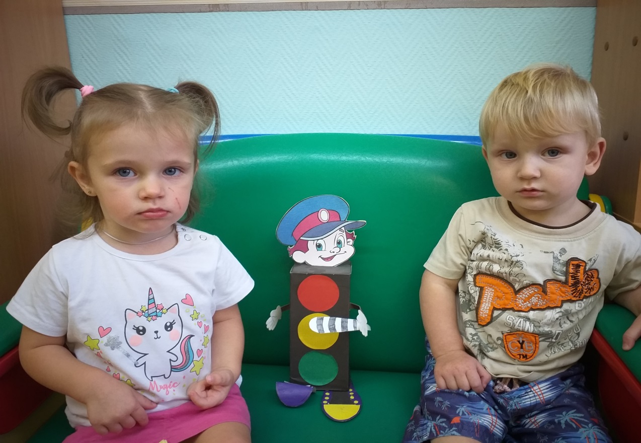 Воспитатель: ребята давайте внимательно рассмотрим нашего гостя! У нашего гостя разноцветные глазки: красный, жёлтый и зелёный. Давайте поиграем в игру поставь машинку в свой гараж ( для игры нужно сделать три гаража красный, жёлтый и зелёный и такого же цвета машинки. Нужно распределить машинки по цвету (свою машинку в свой гараж)). Наш гость светофор будет вам помогать.