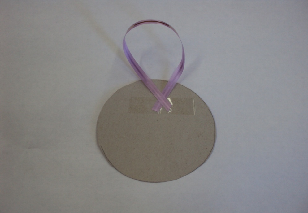 Шаг 2. . Приклейти на картонную основу атласную ленточку, закрепив ее скотчем.