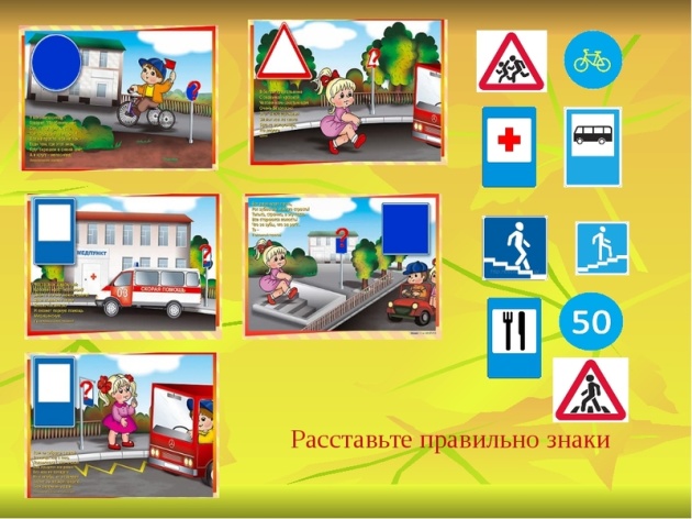 (Учащимся раздается картинка и наборы дорожных знаков). Вам необходимо расставить на данной картинке дорожные знаки в соответствии с дорожной ситуацией. ( Приложение №1)