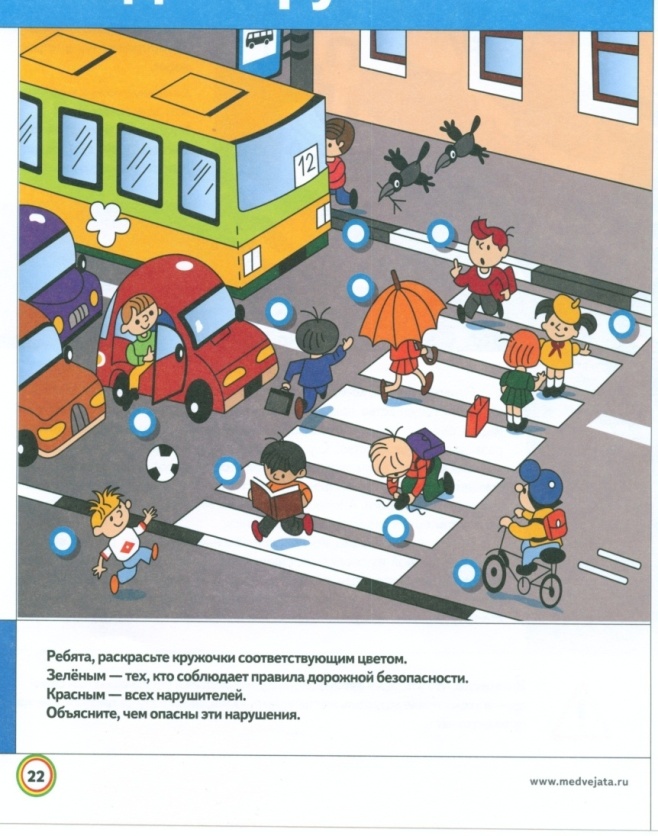 Закон улиц очень строгий. Он не прощает, если пешеход идет по улице, как ему вздумается, не соблюдает правил. Но этот закон и очень добрый: он охраняет людей от страшного несчастья, бережет их жизни. Сейчас вы на этой картинке отметите зеленым цветом тех, кто соблюдает правила дорожного движения, красным – всех нарушителей. Объясните, чем опасны эти нарушения? ( Прилоложение №2)