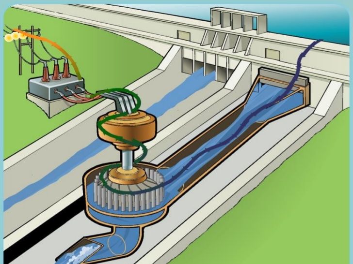 Струя воды поступает на лопасти гидротурбины. Ротор гидротурбины приводится во вращение под действием центробежной силы струи воды. Вал турбины соединяется с валом электрического генератора, и при вращении ротора генератора механическая энергия ротора преобразуется в электрическую энергию.