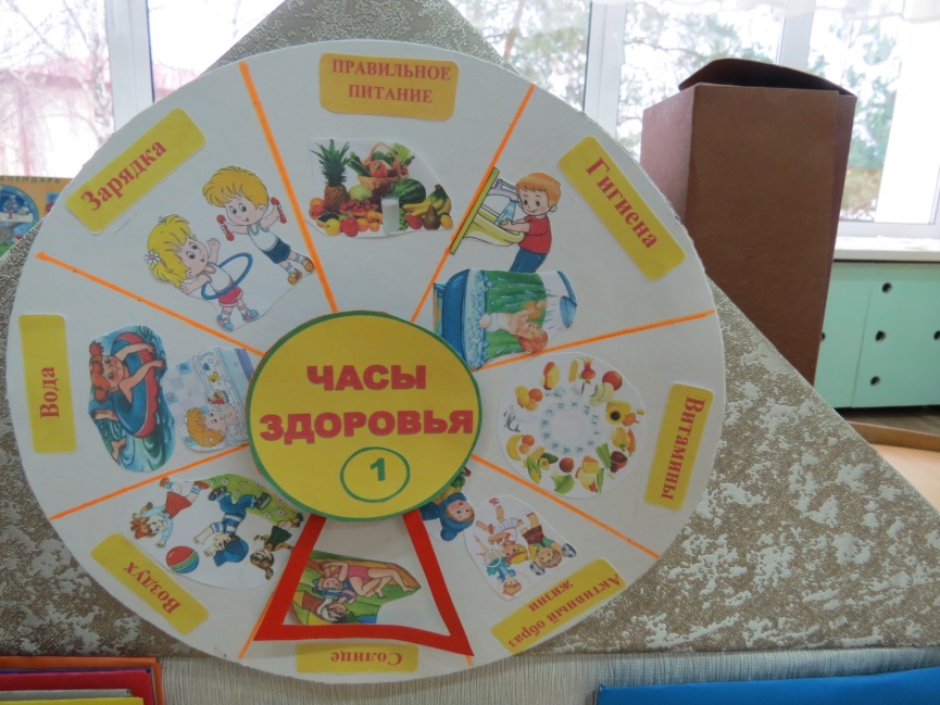 Материал: круг, который разделён на 8 частей, в каждой части есть своя тема («Солнце, воздух и вода – наши лучшие друзья!»; «Гигиена»; «Активный образ жизни»; «Зарядка»; «Правильное питание»; «Витамины»), а также картинки, подходящие под темы, в центре круга стрелочка-рамка.