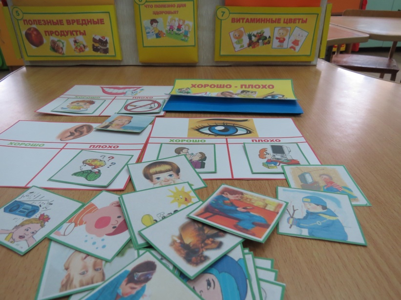 Материал: поля «глаз», «ухо», «зубы», разделённые на две колонки «хорошо», «плохо», картинки с различными ситуациями.
