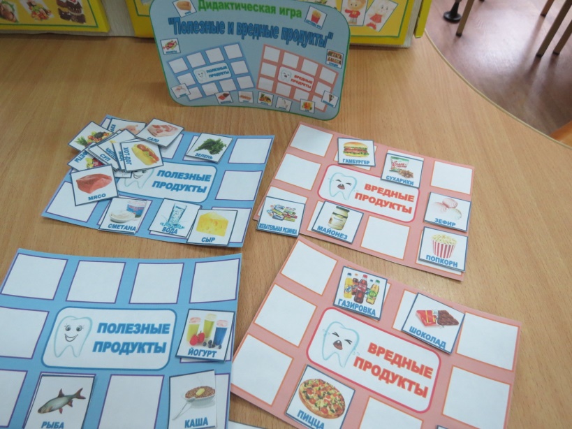 Материал: большие карты с надписью полезно, вредно, разделенные на квадраты, карточки с изображением полезных и неполезных продуктов питания.