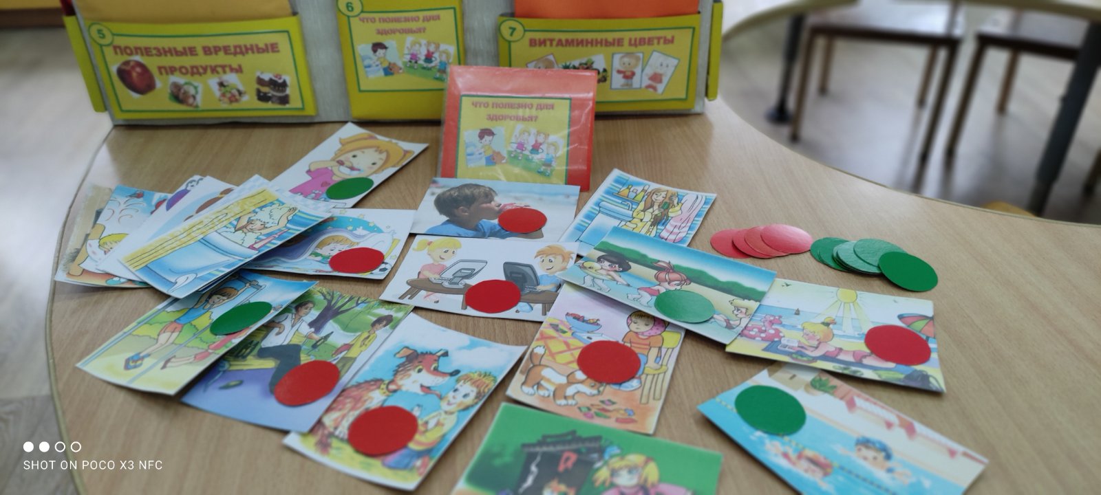 Материал: позитивные (с изображением ситуаций полезных для здоровья) и негативные (с изображением ситуаций, приносящих вред здоровью) картинки, красные и зелёные фишки.