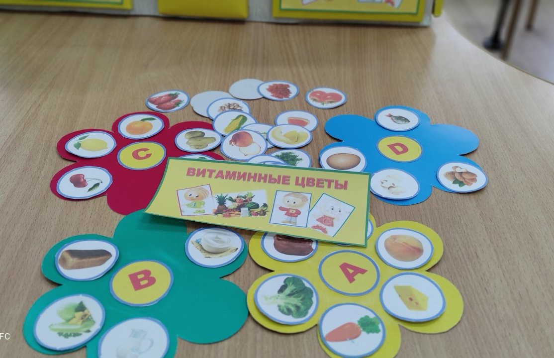 Детям раздаются карточки-«цветы» с изображением витаминов (А, В, С, Д). У ведущего (взрослого) в конверте карточки с изображением продуктов питания. Дети по очереди достают из конверта карточки, рассказывают, какой витамин содержится в продукте и для чего он необходим, раскладывают на «цветок» с нужным витамином. Игра продолжается до тех пор, пока витаминные цветы не будут заполнены. Выигрывает тот, кто первый заполнит витаминный цветок карточками.