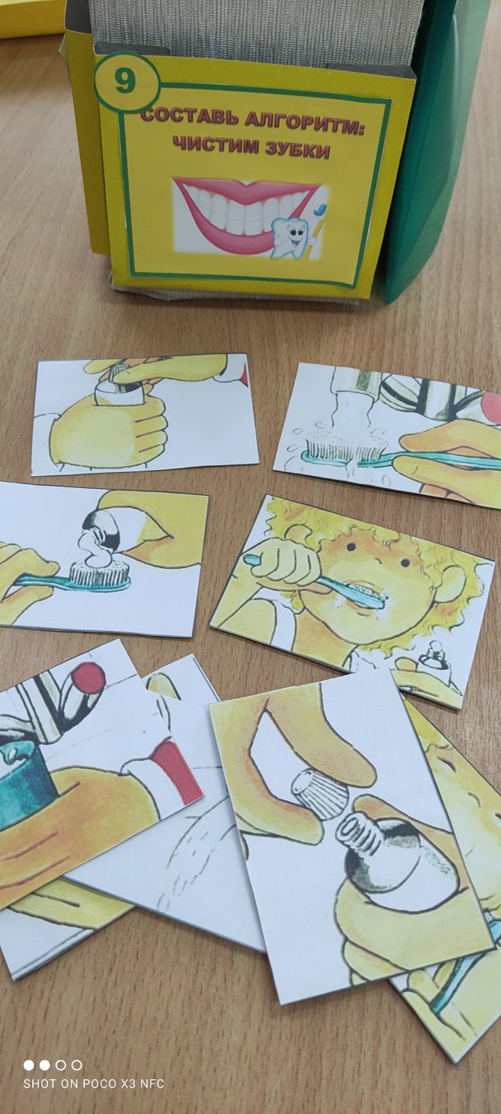 Материал: иллюстрированные карточки последовательности чистки зубов.